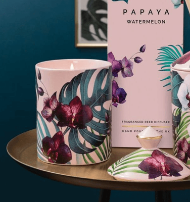 Indulge in the delightful fusion of exotic fruits and florals with the Urban Botanics Ceramic Papaya Watermelon Scented Candle.