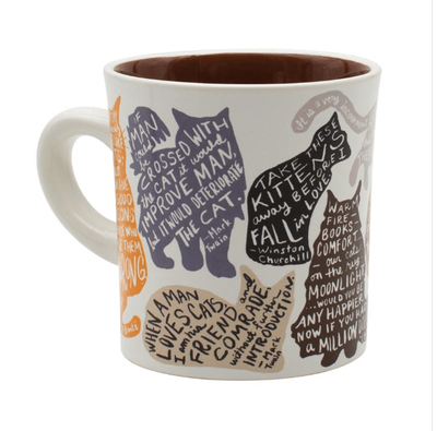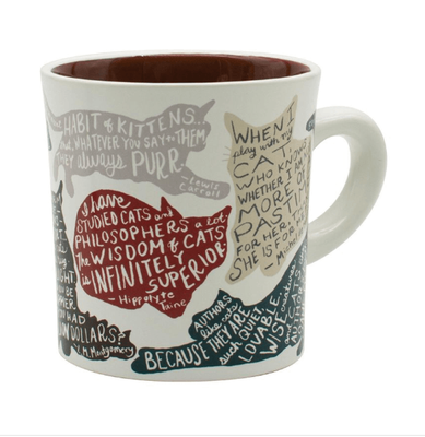 - This calico-cat-colored mug features nine cat silhouettes and nine quotes from prominent men and women of letters who cannot resist a kitten.